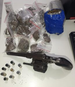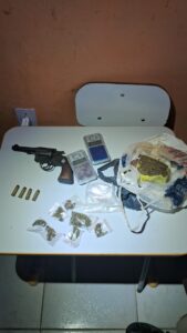Segundo o registro da ocorrência, com o suspeito foram apreendidos um revólver calibre .32, com duas munições intactas e quatro cartuchos deflagrados, além de três munições do mesmo calibre encontradas no interior de uma mochila, totalizando cinco munições intactas e quatro estojos deflagrados.