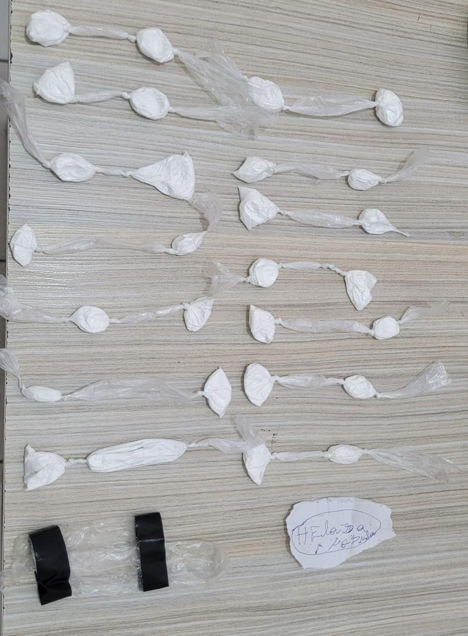 A suspeita foi alcançada ainda em via pública. Durante a abordagem, os policiais solicitaram que ela esvaziasse os bolsos, momento em que foi encontrada uma sacola contendo 28 trouxinhas de uma substância branca, com características semelhantes à cocaína.