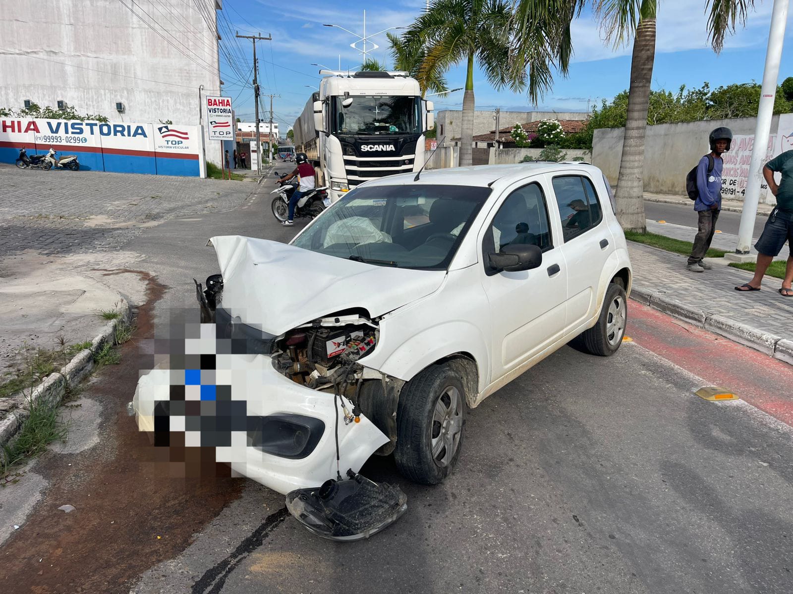 A colisão causou danos significativos à frente do carro, que ficou completamente destruída.