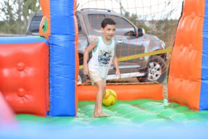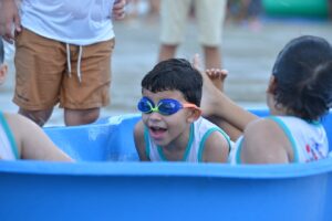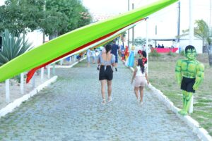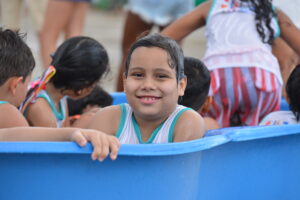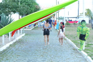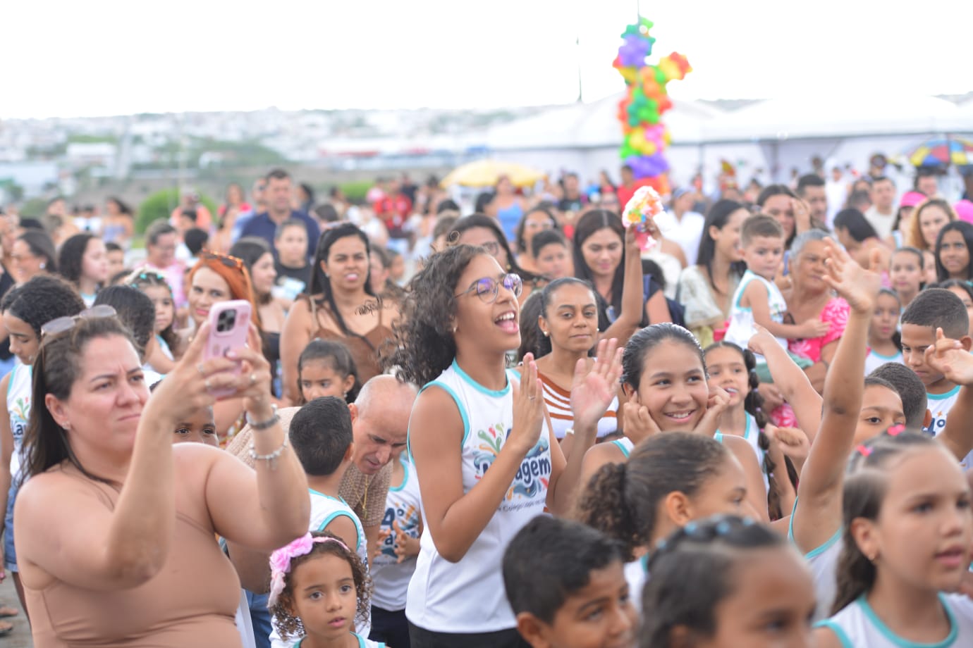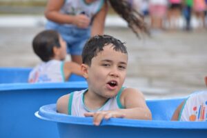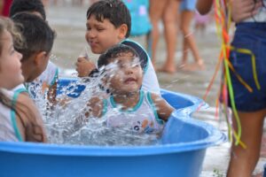 Durante o evento, os alunos puderam se refrescar nas piscinas, saborear diversas guloseimas, aproveitar brinquedos infláveis e se divertir ao som da animadora Tia Lu, que garantiu a alegria da garotada com músicas, danças e atividades recreativas. A programação contou ainda com o touro mecânico, que fez sucesso entre crianças, proporcionando momentos de muita animação e desafio.