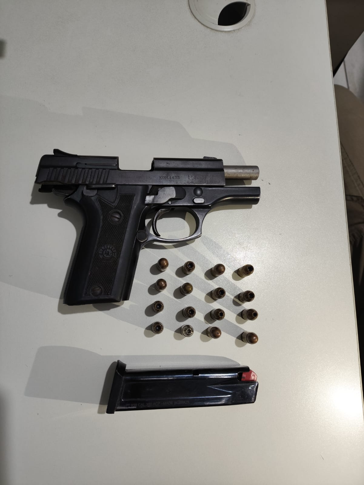 Durante a revista, foi apreendida uma pistola da marca Taurus, calibre .380, modelo 938, municiada com 16 cartuchos intactos.