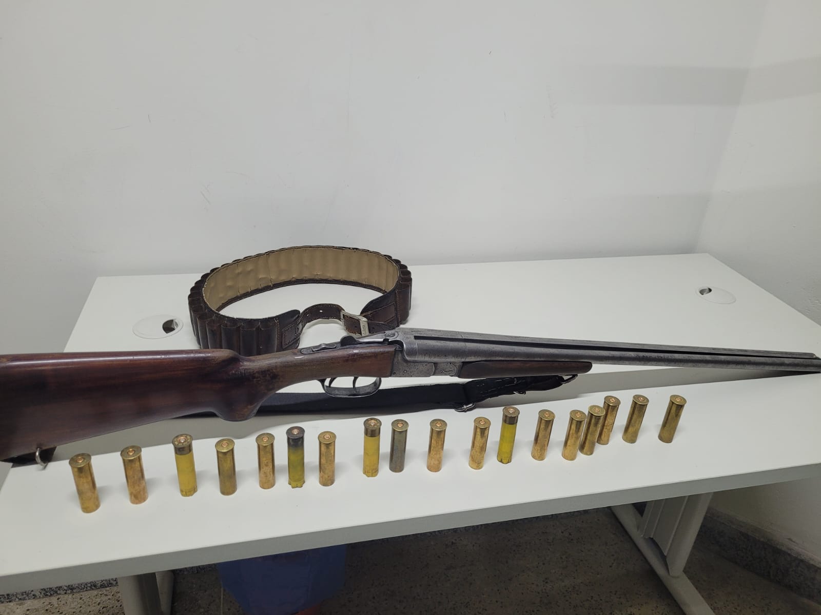 No local, foi apreendida uma espingarda Rossi, calibre 20, com dois canos paralelos Também foram encontrados 14 cartuchos intactos e quatro deflagrados.