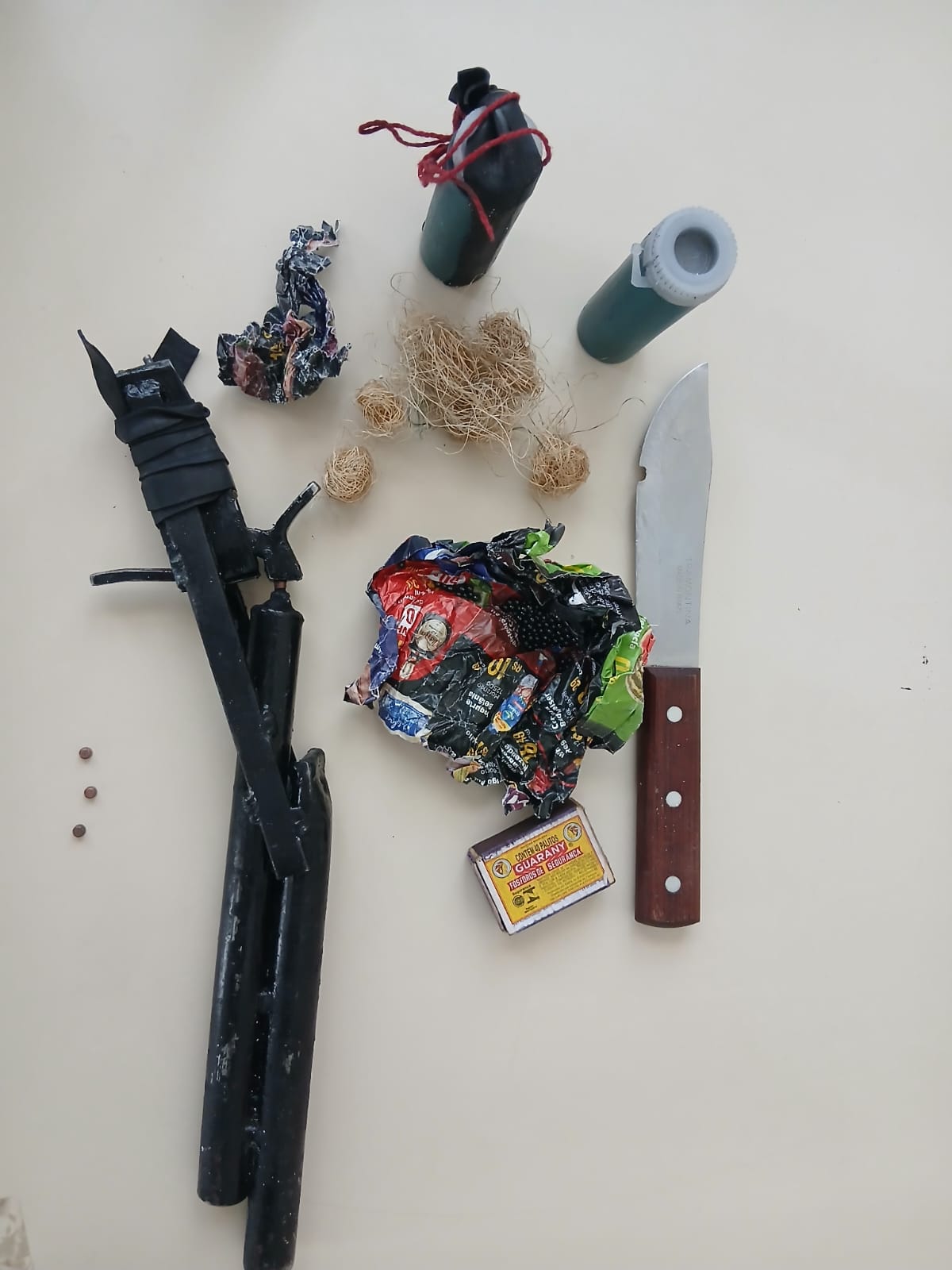 A arma e os outros materiais foram apreendidos e as providências legais cabíveis foram adotadas.