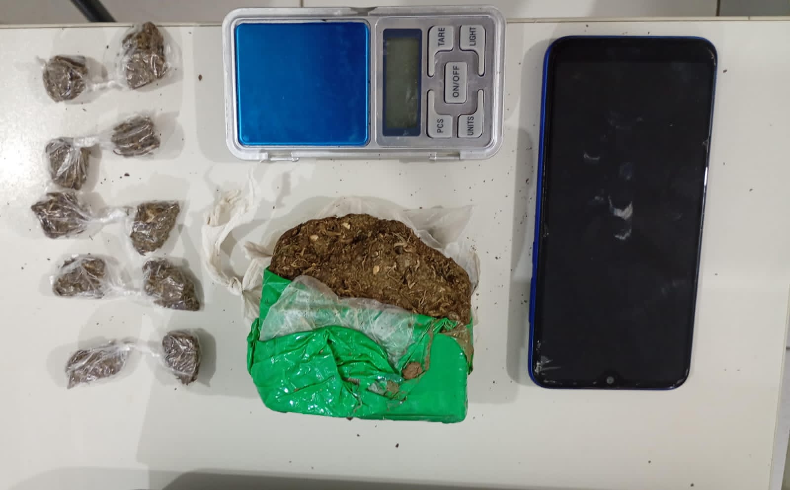 Com ele, os policiais encontraram uma sacola plástica contendo 10 trouxinhas de maconha, uma porção da mesma droga pesando 164 gramas, uma balança de precisão e um celular Redmi azul.