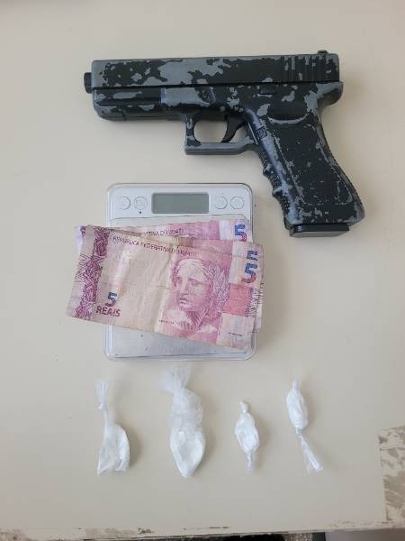 Durante a revista, foi encontrado um simulacro de arma de fogo. Em uma bolsa que o suspeito carregava, os militares localizaram porções de substância análoga à cocaína, uma balança de precisão e embalagens comumente utilizadas para acondicionamento de entorpecentes.