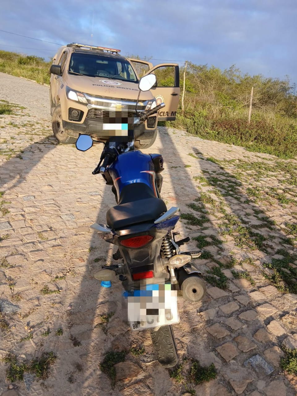 Durante a verificação, os policiais constataram que o número do chassi estava suprimido, o que impossibilitou a identificação imediata do veículo. Após consulta, foi verificado que a moto, uma Honda/CG 160 Titan azul, (Palhoça-SC), estava baixada definitivamente e classificada como sucata, o que significa que não poderia circular.