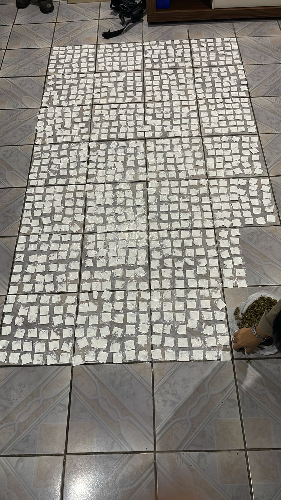 Ao todo, foram apreendidos 943 papelotes de substância análoga à cocaína, uma quantidade de skank, uma trouxinha de maconha, 47 recipientes plásticos utilizados para embalar drogas, além de dois aparelhos celulares, um Moto G15 e um iPhone 11.