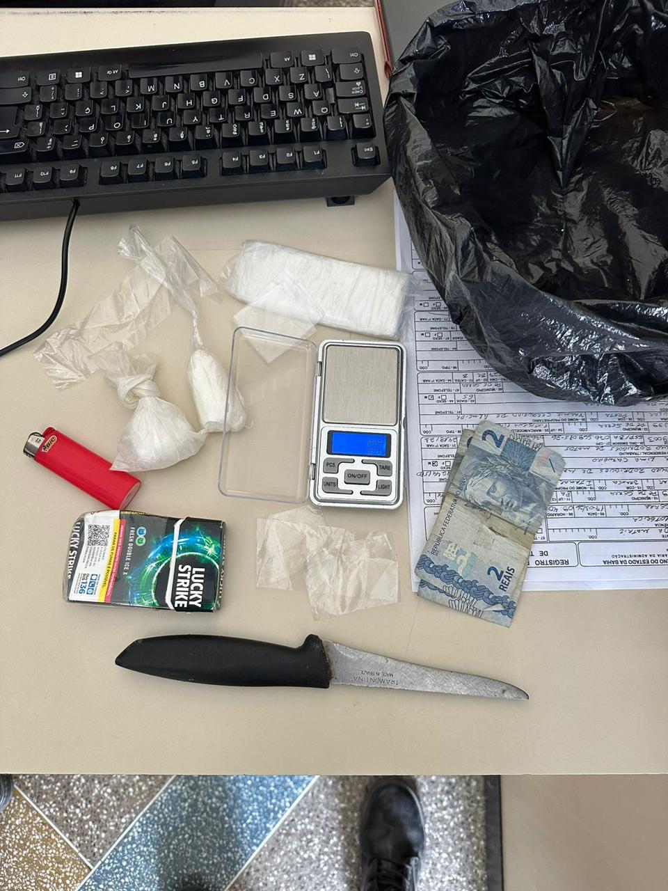 Durante a abordagem e busca pessoal, os militares encontraram uma sacola contendo duas embalagens de substância análoga à cocaína, uma balança de precisão, um isqueiro, um pacote de embalagens plásticas e duas cédulas de R$ 2,00 em espécie. Ao todo, foram apreendidos 42 gramas de cocaína.